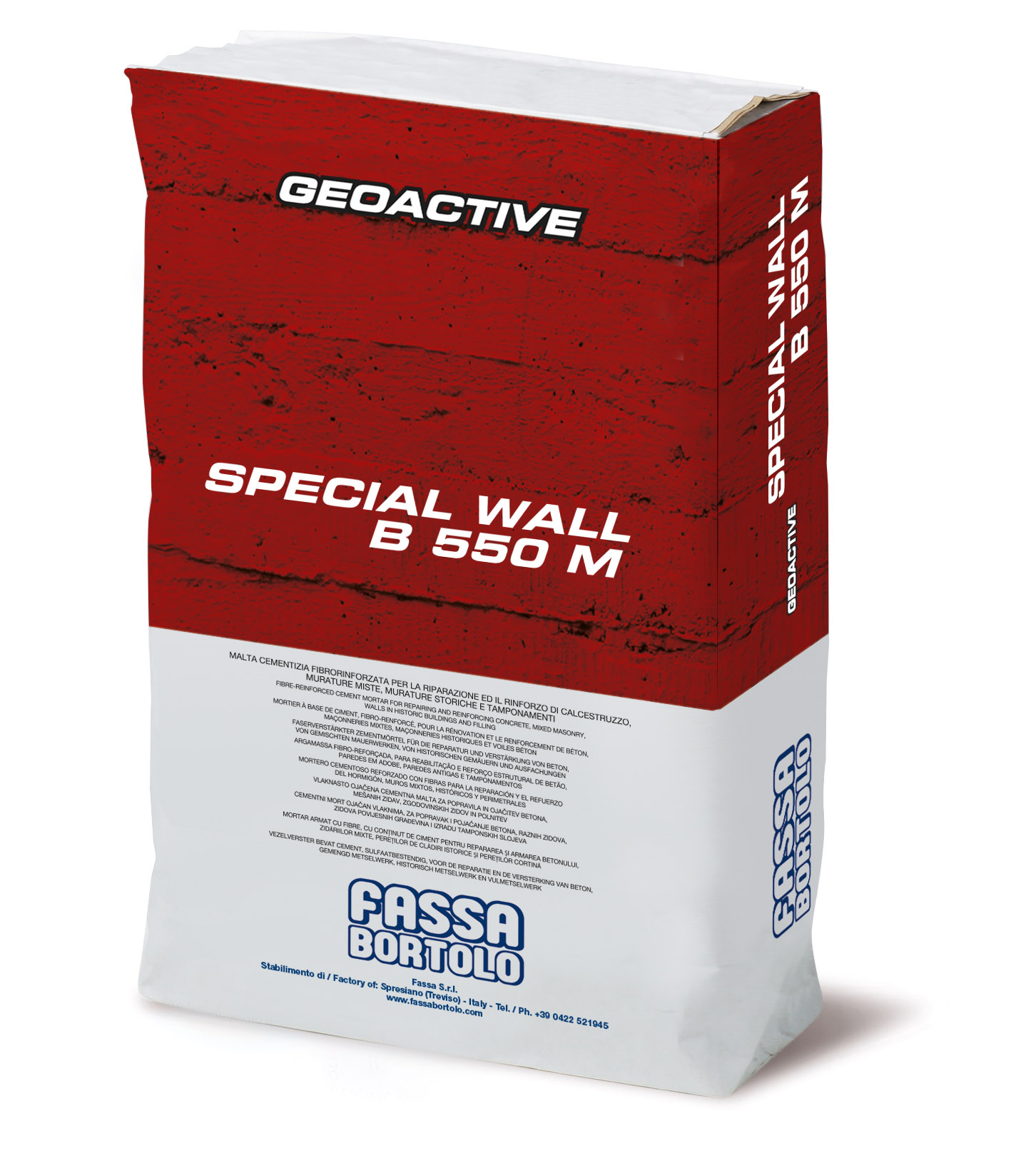 SPECIAL WALL B 550 M está indicado para trabajos de consolidación o refuerzo estructural con malla metálica electrosoldada de estructuras de mampostería y de hormigón. También se utiliza para reparar los bordes de vigas y pilares, para reparar cornisas y balcones dañados y para obras de reconstrucción de las capas corticales en obras de hormigón armado cuando se requieren resistencias mecánicas medianas.