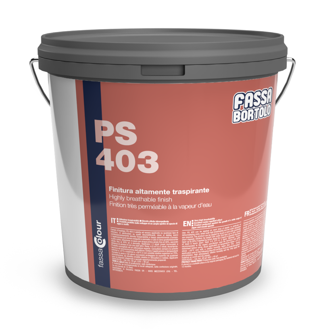 PS 403 es una pintura de aspecto mineral, transpirante y decorativa para exteriores. La naturaleza de las materias primas utilizadas hace que PS 403 sea apta para ser aplicada en cualquier tipo de enlucido para exteriores, especialmente en los sistemas de saneado (incluidos los sistemas de deshumidificación) y cuando se requieren características de alta transpiración, resistencia al agua y buena resistencia al exterior.